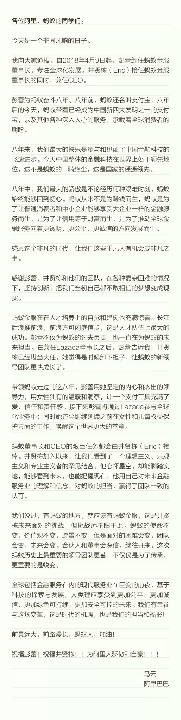 4月9日早间,阿里巴巴董事局主席马云向员工发出了一封内部信。内部信宣布,彭蕾将卸任蚂蚁金服董事长,蚂蚁金服CEO井贤栋将兼任董事长一职。