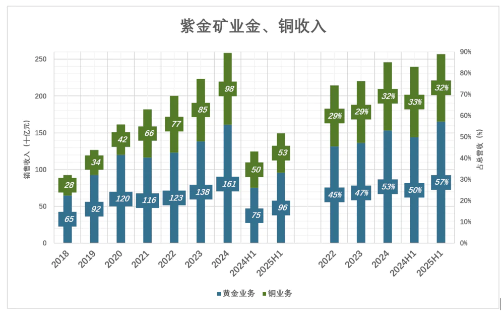 2025年H1.黄金、铜业务收入分别为959亿、533亿,分别占总营收的57.2%、31.8%;