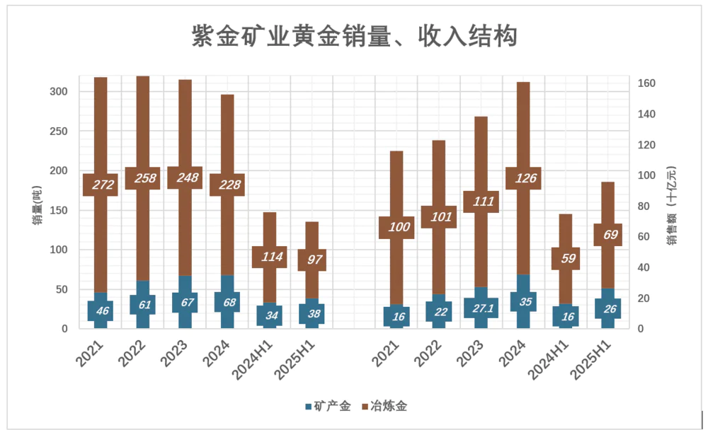 2025年H1.矿产金、冶炼金销量分别为38吨、997吨,矿产金占比28.2%;销售额分别为265亿、694亿,矿产金占比27.6%;