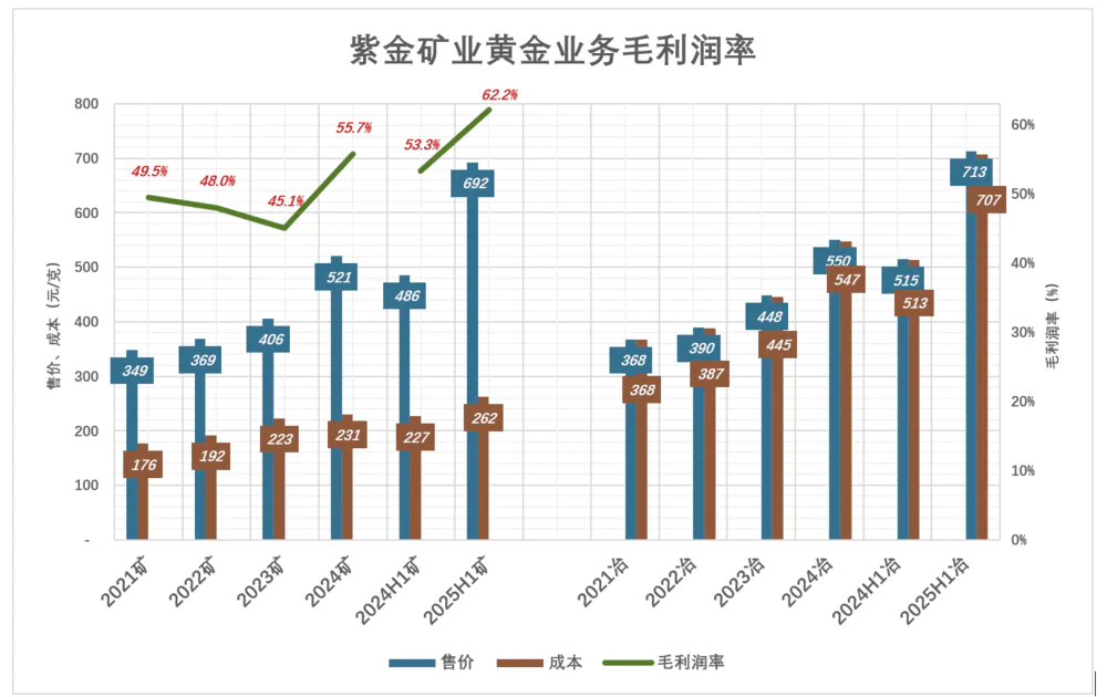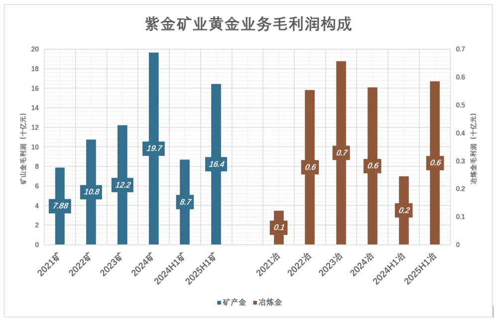 2024年,矿产金销售额353亿、毛利润197亿;冶炼金销售额高达1255亿(占总营收的41.3%)、毛利润仅5.6亿,占黄金业务毛利润的1.8%。