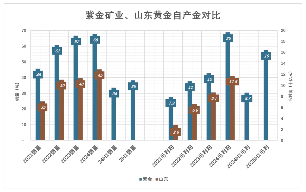 到2024年,山东黄金矿山产金销量达67.8吨,山东黄金自采销量45.2吨,相当于紫金的66.7%;毛利润118亿、相当于紫金的60%。