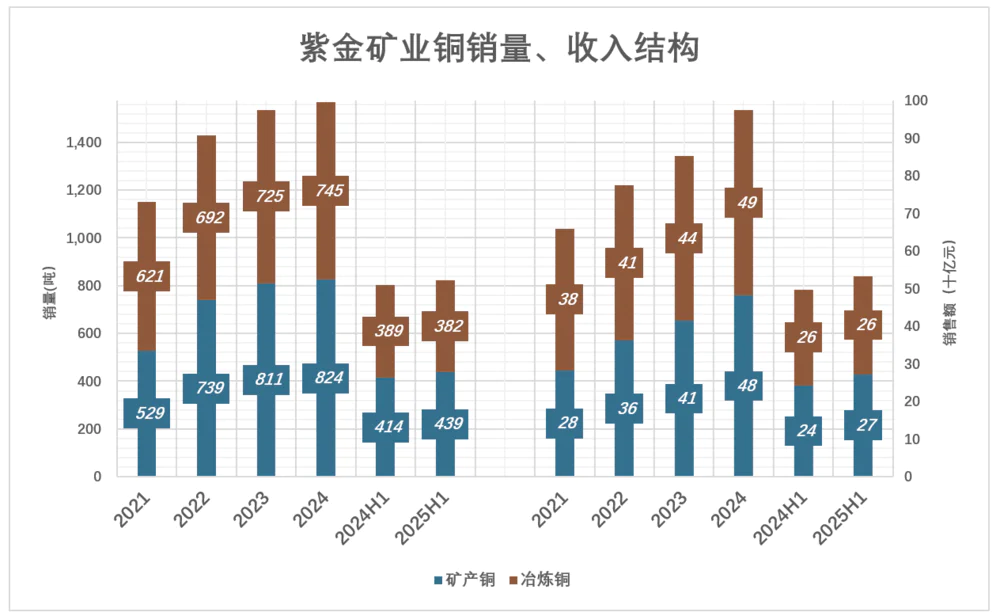 2025年H1.矿产铜、冶炼铜销量分别为43.9万吨、38.2万吨,矿产铜占53.5%;销售额分别为273亿、261亿,矿产铜占比51.1%;