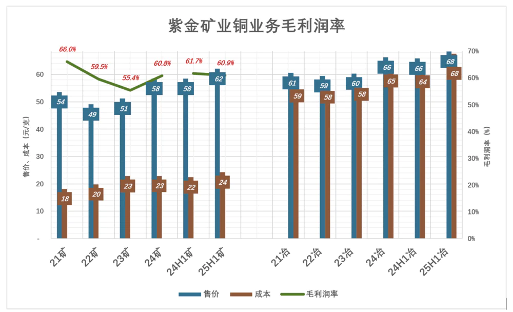 2025年H1,矿产铜售价进一步提高到6.21万元/吨,毛利润率60.9%;冶炼铜售价、成本分别6.83万元/吨、6.76万元/吨,毛利润率1.1%;
