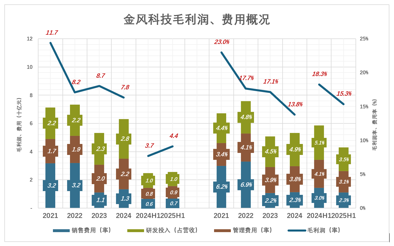 用蓝色折线代表毛利润(率),彩色堆叠柱代表费用(率),蓝色淹没彩色时方能获得经营利润。