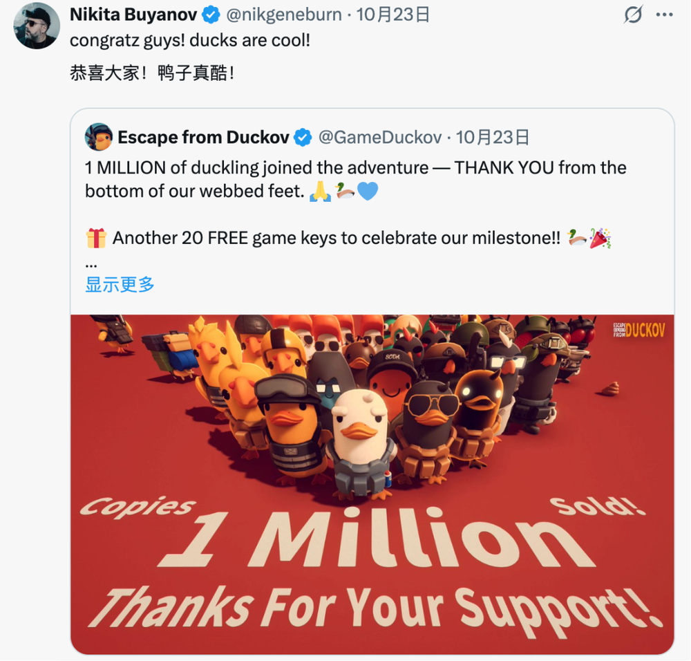 从销售成绩来看,“风口上的鸭子”也卖疯了:《逃离鸭科夫》在 Steam 前两周优惠售价 51.04 元,按照 12 天爆卖 200 万份的速度,销售额已超 1 亿元——就连《逃离塔科夫》制作人 Nikita Buyanov 都在转发《逃离鸭科夫》的动态,并给予“ducks are cool”的肯定。